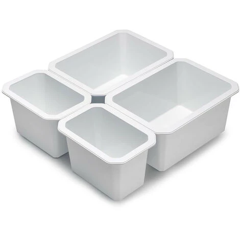 Selon le modèle choisi, 4 bacs organisateurs (2 grands bacs 220 x300mm et 2 petits bacs 220 x150mm) ou 6 bacs organisateurs (4 grands bacs 220 x300mm et 2 petits bacs 220 x150mm) sont fournis. Ils sont fabriqués en plastique ABS, avec une élégante finition gris anthracite ou blanche, des couleurs tendance dans le design des meubles de salle de bains, idéales à combiner avec les tiroirs Emuca.