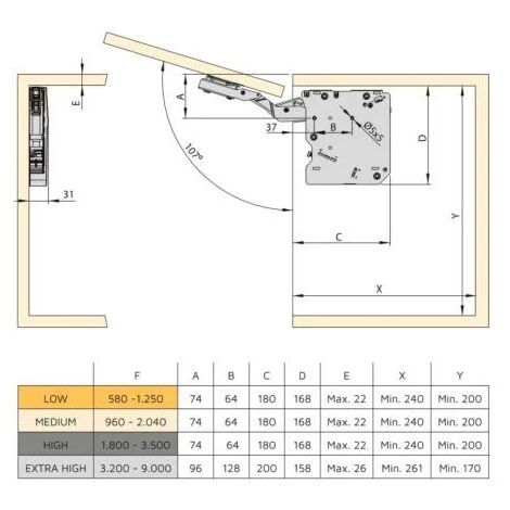 <p><strong>SystĂšme de compas pour portes relevables </strong>des meubles de la cuisine et de la maison, Ă fonctionnement doux et prĂ©cis. Il <strong>ne requiert pas de charniĂšres pour le montage</strong>, ni dÂoutils pour le dĂ©montage de la porte, grĂące Ă son systĂšme de clipsage. Conçu pour des modules allant jusquÂĂ 1.200 mm de largeur et de 250 Ă 500 mm de hauteur. Dispose dÂun rĂ©glage de la force du mĂ©canisme et de la position de la porte en trois dimensions ±2mm, ainsi que de la vitesse de la fermeture douce.</p><p>Il est disponible en trois intervalles de force afin de sÂadapter Ă une grande gamme de portes de dimensions et poids diffĂ©rents Ă choisir selon le rĂ©sultat des formules de calcul. Le systĂšme est fourni avec les caches disponibles en <strong>finition blanc et gris anthracite</strong>, les fixations, les vis et le gabarit de montage.</p><br><ul><li>SystĂšme de compas conçu pour portes relevables et montage sans charniĂšres.</li><li>Angle dÂouverture de la porte 107 pour mieux profiter de lÂespace et pour un accĂšs plus facile Ă lÂintĂ©rieur.</li><li>Conçu pour modules allant jusquÂĂ 1.200 mm de largeur et de 250 Ă 500 mm de hauteur, et panneaux de 16 mm Ă 28 mm.</li><li>Le systĂšme dispose dÂun rĂ©glage de la force du mĂ©canisme et de la position de la porte en trois dimensions ±2mm, ainsi que de la vitesse de la fermeture douce.</li><li>DĂ©montage facile de la porte sans besoin dÂoutils grĂące Ă son systĂšme de clipsage.</li><li>Compas pour forces entre 1.800 – 3.500 (voir formules).</li><li>Le jeu de compas est fourni avec les fixations, les vis et le gabarit de montage.</li><li>Comprend les caches en couleur blanc.</li></ul><br><br>MATĂRIEL: Acier et plastique<br>COMPOSANTS: 2 compas relevables (montage Ă droite et Ă gauche), 2 caches (montage Ă droite et Ă gauche), fixations, vis, gabarit<br>POIDS: 1.7200 Kg<br>COULEUR: Blanc