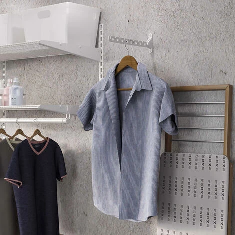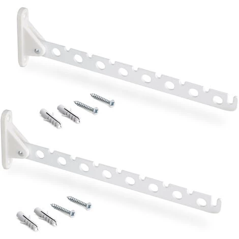 Ils sont conçus pour être fixés sur le mur et sont fabriqués en acier laqué blanc et en plastique. Ce kit est composé de deux cintres ainsi que des vis et chevilles nécessaires à leur installation.