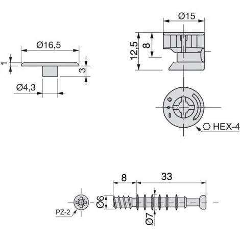 Emuca Excentrique + goujon, D. 15 mm, panneau 16 mm, Zamak et acier, Blanc, 20 ut.