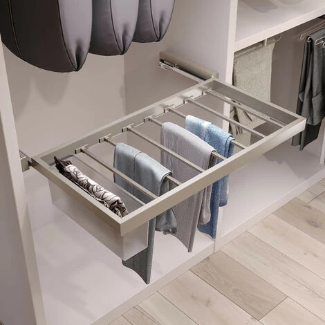 – Des tringles à pantalons pour les placards et les dressings, conçues pour suspendre des pantalons ou des vêtements, qui est monté avec le rack coulissant Hack.