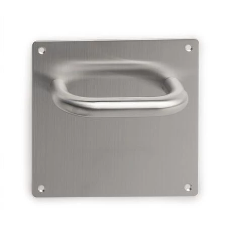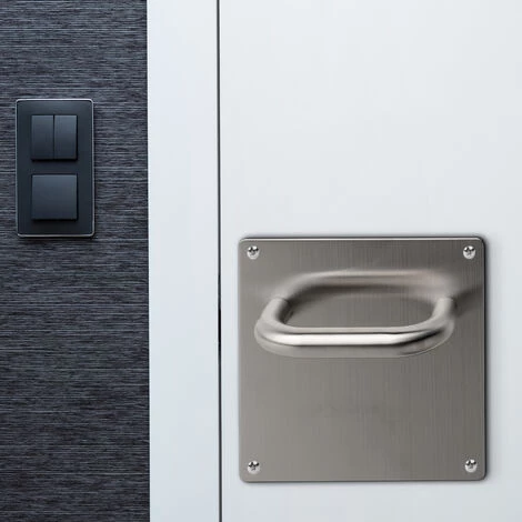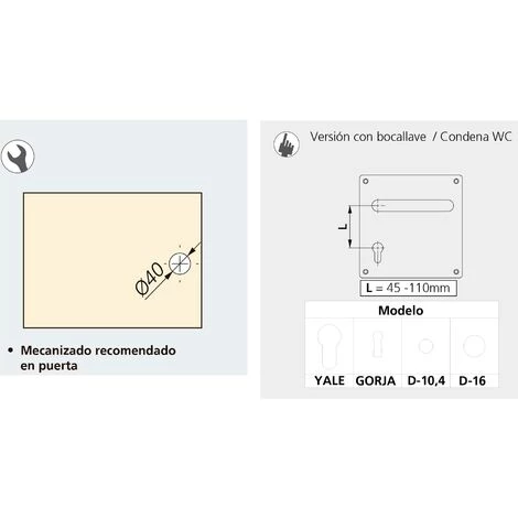 Jeux de poignées avec plaque 17x17cm pour porte d’intérieur. Elles sont valables pour portes d’épaisseur entre 35mm et 45 mm et ont un ressort de rappel pour retourner la béquille à la position horizontale. Usinage de porte recommandé: Ø40mm