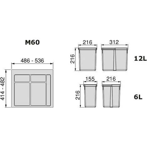 – Poubelles de 216 mm de hauteur avec base pour tiroir de module de 600 mm.