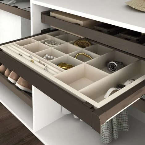 <p>Le <strong>Kit contient un tiroir organisateur et un cadre coulissant réglable </strong>pour l’adapter à l’intérieur de l’armoire. La structure est équipée avec des<strong> coulisses invisibles à sortie totale et fermeture amortie</strong>, et d’un <strong>système de clipsage automatique</strong> et rapide pour son installation. Le cadre est fabriqué en <strong>aluminium finition couleur moka </strong>et le <strong>tiroir en bois </strong>avec compartiments intérieurs.</p><br><ul><li>Valable pour intérieur d’armoire de 564-614 mm.</li><li>Profondeur minimum du meuble 480 mm.</li><li>Le Kit se compose d’un tiroir organisateur de largeur 483mm et d’un cadre coulissant réglable en largeur.</li><li>Coulisses invisibles à sortie totale et fermeture amortie, avec système de clipsage automatique et rapide pour l’installation du cadre.</li><li>Finition couleur moka.</li></ul><br><br>MATÉRIEL: Aluminium, plastique et acier<br>COMPOSANTS: 1 tiroir organisateur, 1 cadre coulissant, ferrures et instructions de montage<br>DIMENSIONS: 48 x 17 x 51<br>POIDS: 6.811 Kg<br>MESURE: Module 600 mm<br>COULEUR: Moka