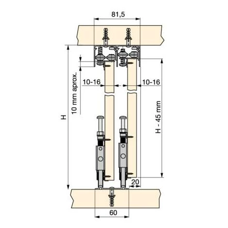 <p>Matériel: acier, plastique et zamak<br></p><p>Poids maximum de la porte 40 kg</p><p>Épaisseur planche 10-16 mm</p><p>Chariot inférieur réglable en hauteur de 20 mm</p><p>Glissement à billes</p><p>Si vous voulez fermeture en soft acheter cod. 6102320 ou 6102420</p>