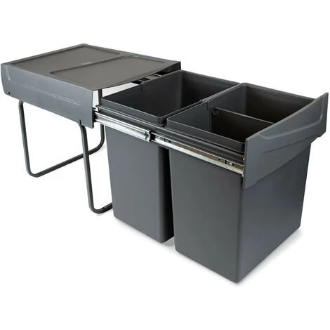 L’ensemble comprend deux conteneurs amovibles de 20 litres avec une poignée simple pour un retrait facile et un séparateur pour l’un des conteneurs. Fabriqué en acier et plastique gris anthracite.