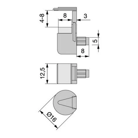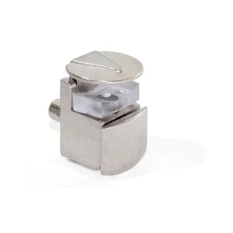 Support pour étagères en verre entre 4 et 8mm.<br>La partie supérieur du support est réglable afin de fixer le verre.<br>Taquet de 5mm.<br>Finition: nickelé<br><br><br><br><br>