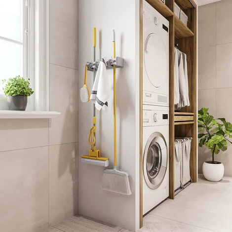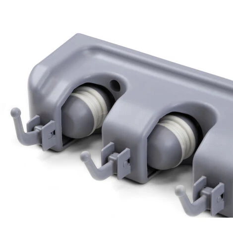Support de suspension pour les éléments de nettoyage qui vous permet d’organiser votre cuisine ou votre pièce de rangement de manière pratique et peu encombrante. Parfait pour suspendre balais, balais à franges, poubelles et torchons grâce à ses 4 trous et ses 5 crochets. Les trous sont munis de billes roulantes qui leur permettent de s’adapter à l’épaisseur du manche du balai ou du balai à franges et de le tenir fermement. Le déverrouillage est facile, il suffit de soulever légèrement le manche du balai. Installation facile à l’aide des vis fournies. Fabriqué en plastique haute résistance en finition couleur grise.
